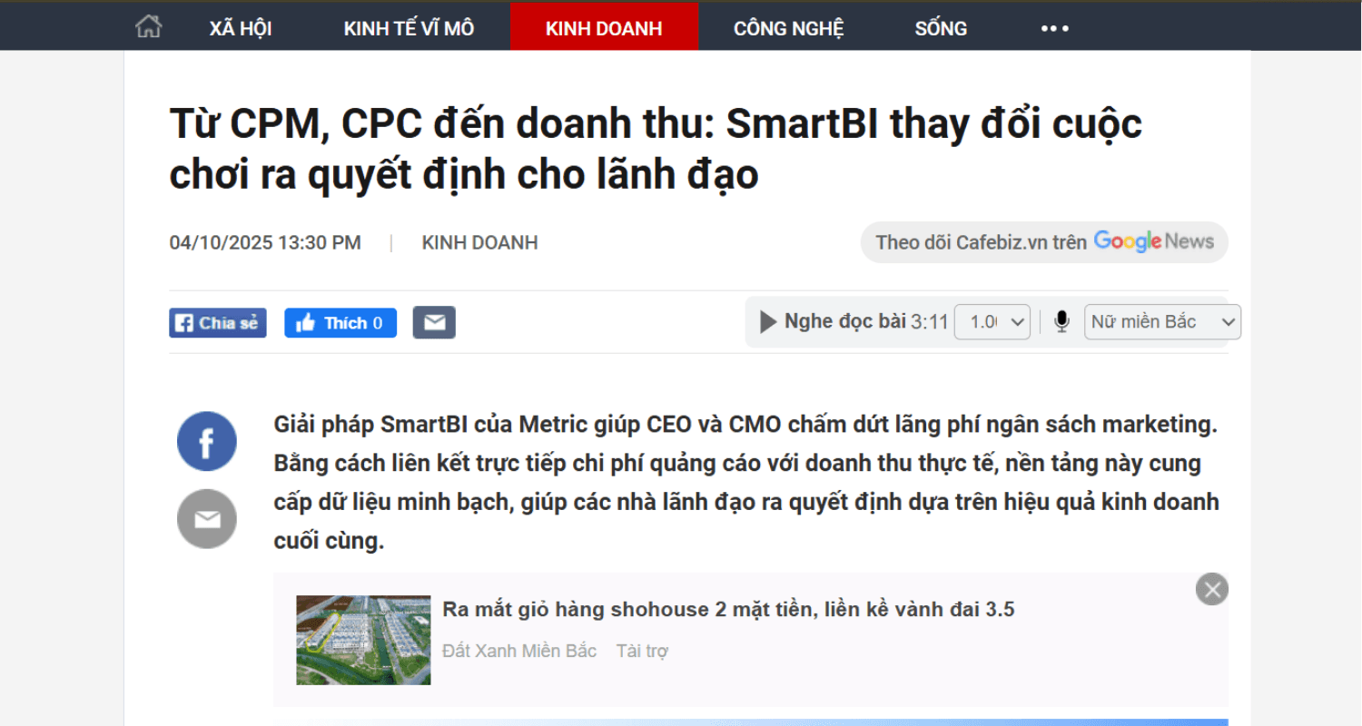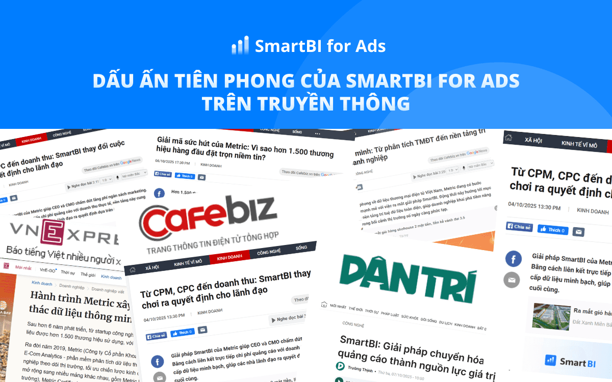Từ phân tích dữ liệu, tối ưu quảng cáo đến hỗ trợ lãnh đạo ra quyết định nhanh và chính xác - báo chí đang dành sự quan tâm đặc biệt cho giải pháp Business Intelligence do Metric phát triển. Không chỉ là công cụ xem báo cáo đơn thuần, SmartBI for Ads đang trở thành “trợ lý chiến lược” giúp doanh nghiệp Việt vận hành marketing dựa trên dữ liệu thực chiến.